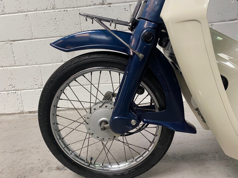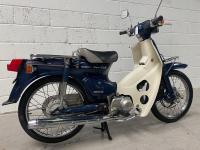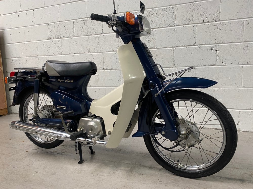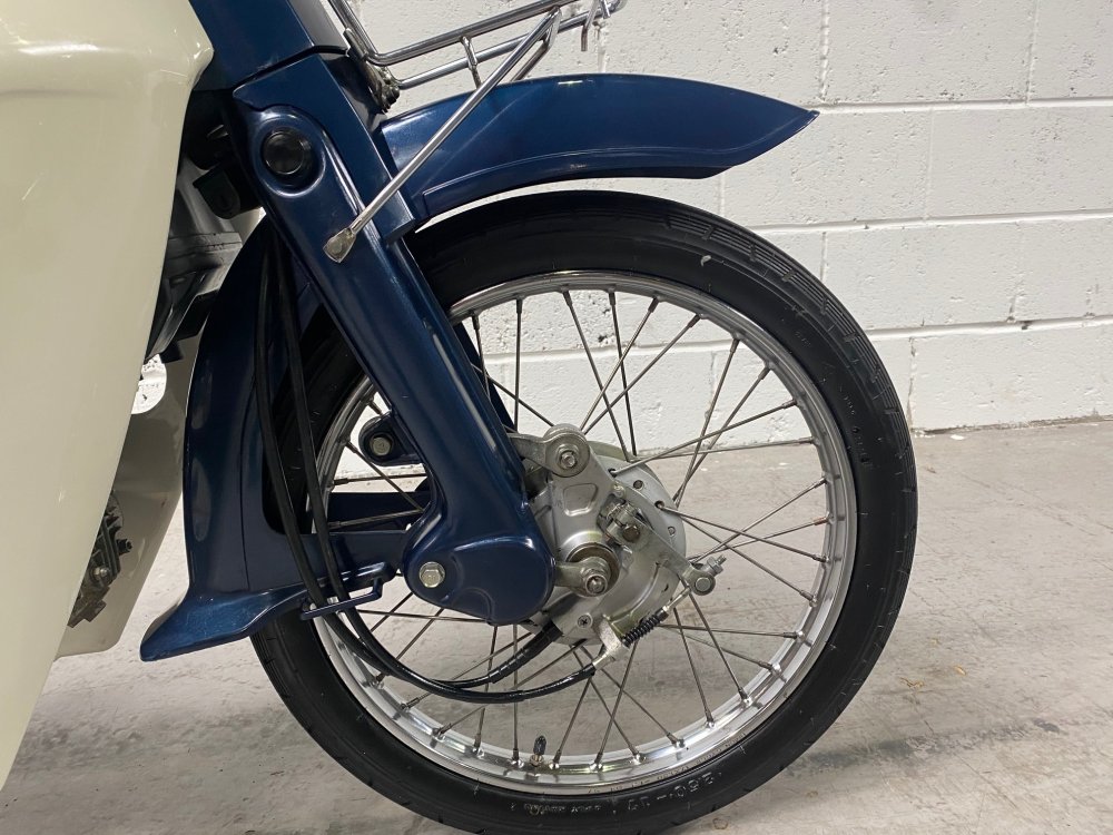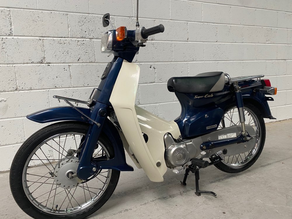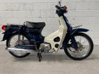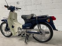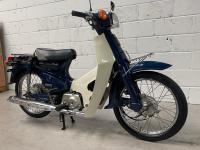 This one comes in dark blue with racks front and rear and exhaust guard. It has four-speed transmission. In lovely condition and with the Honda badge on the leg covers. It comes with a three-month warranty.