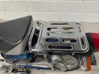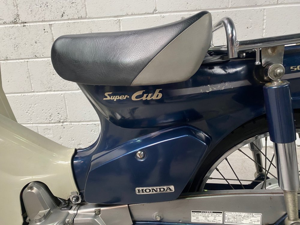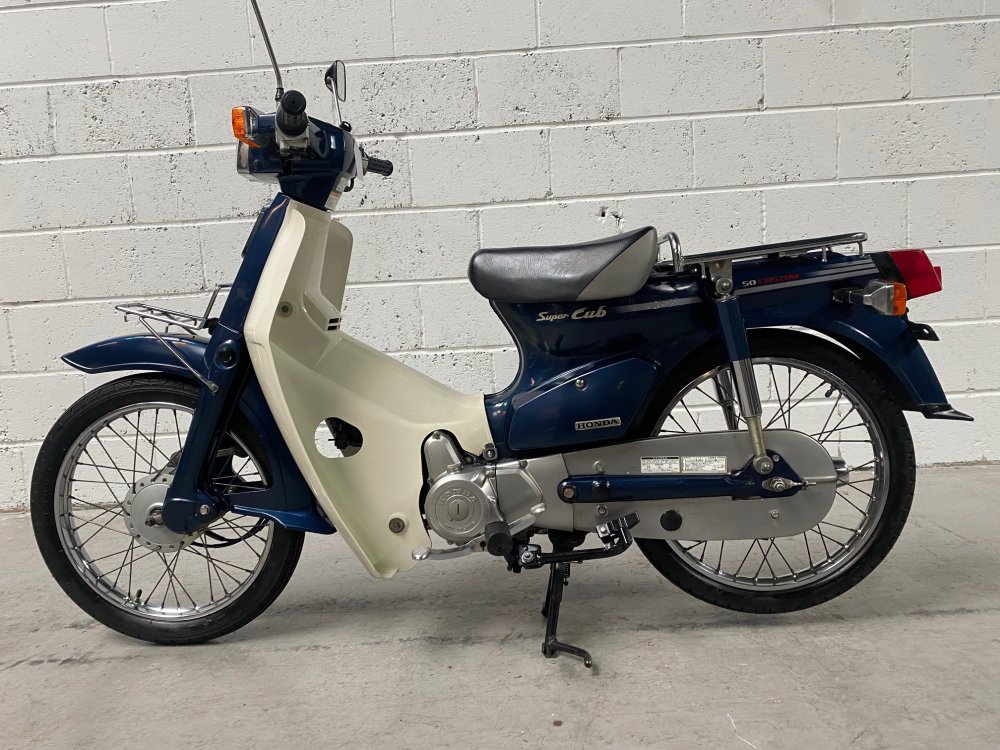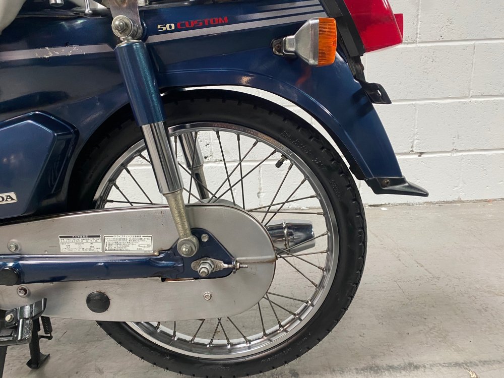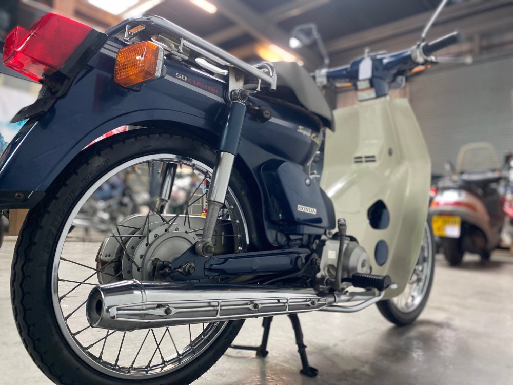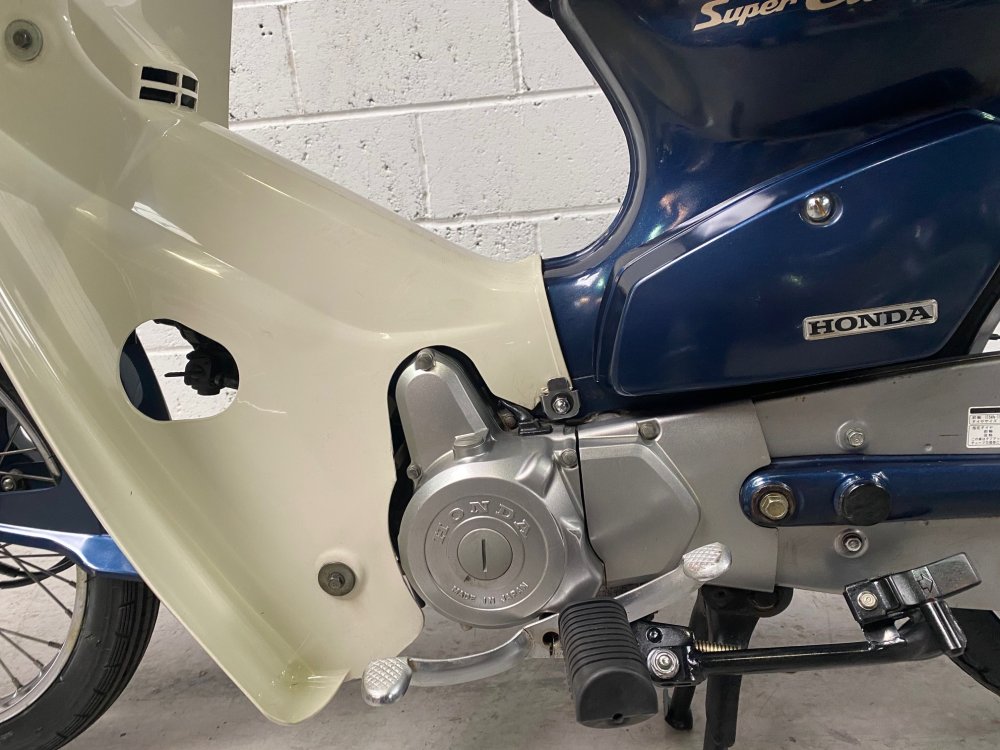 This one comes in dark blue with racks front and rear and exhaust guard. It has four-speed transmission. In lovely condition and with the Honda badge on the leg covers. It comes with a three-month warranty.