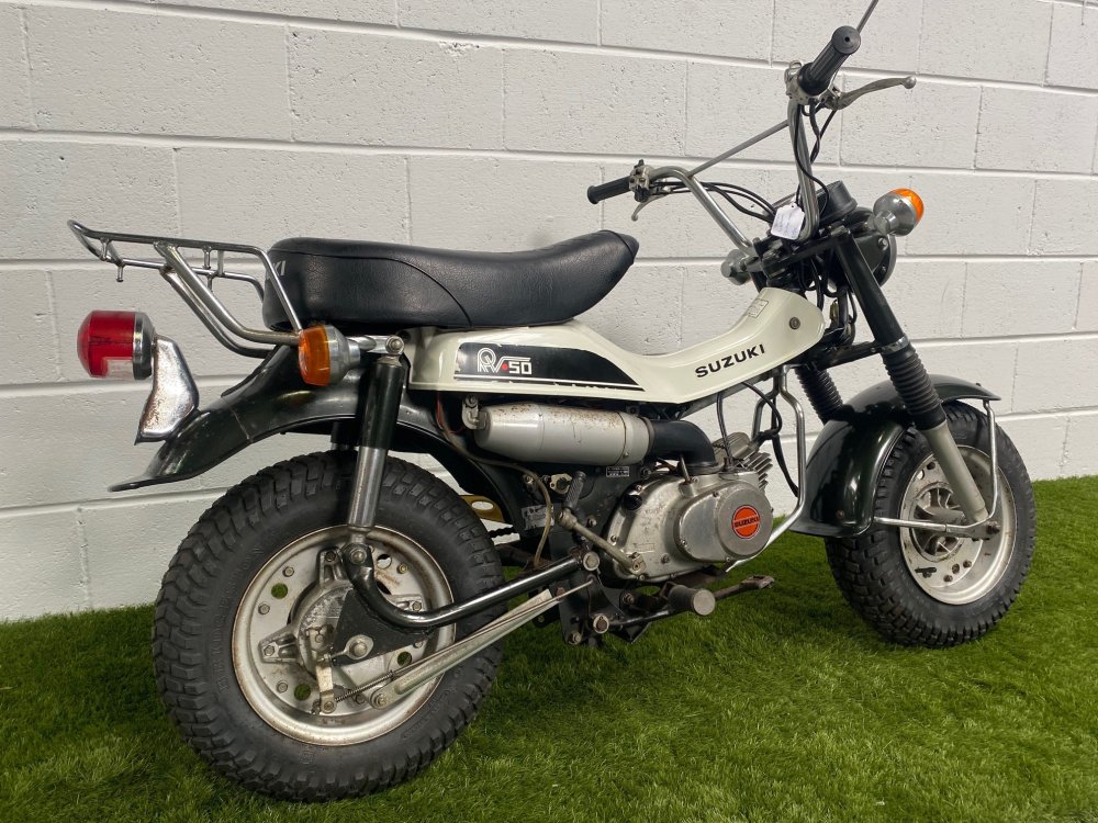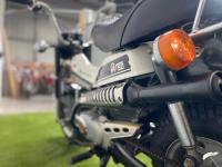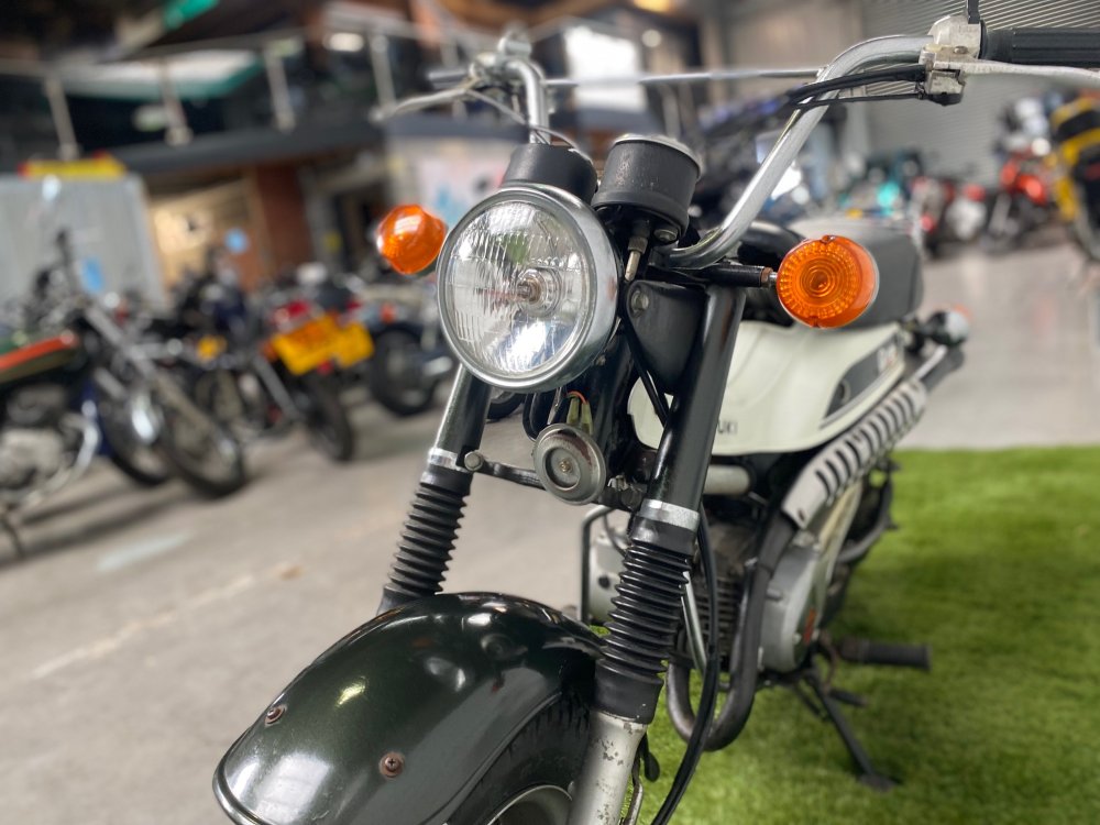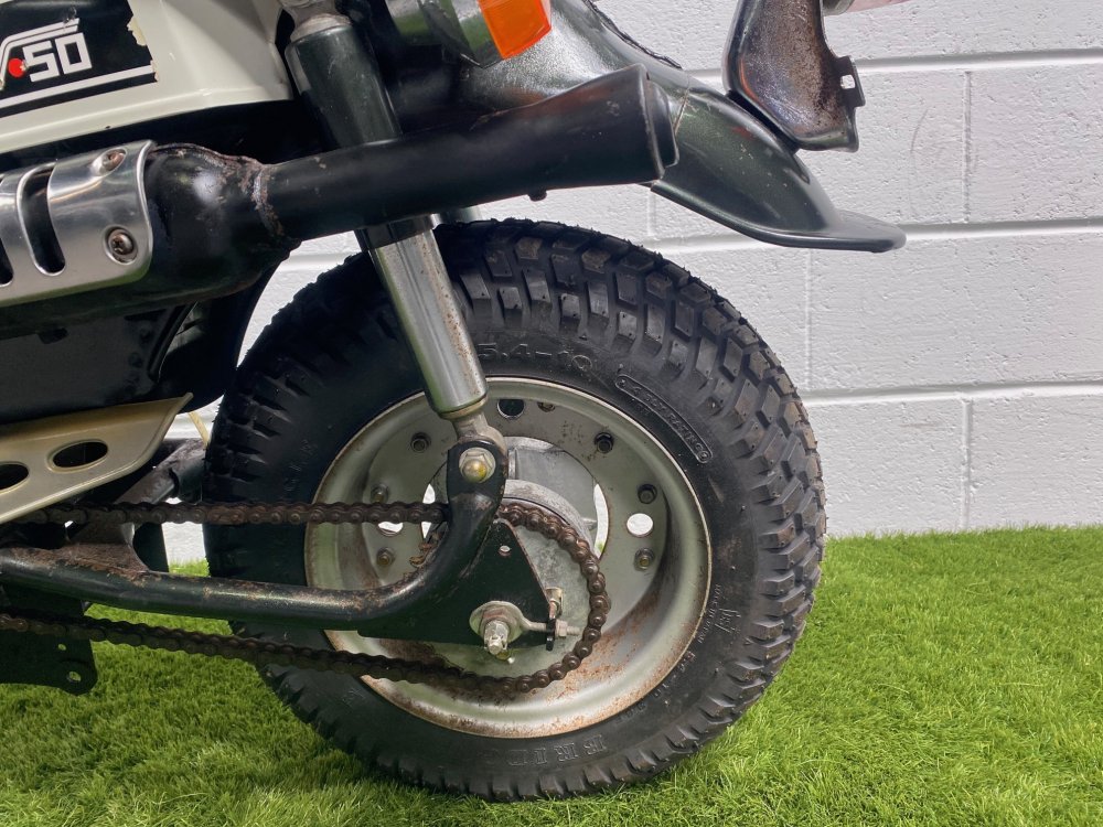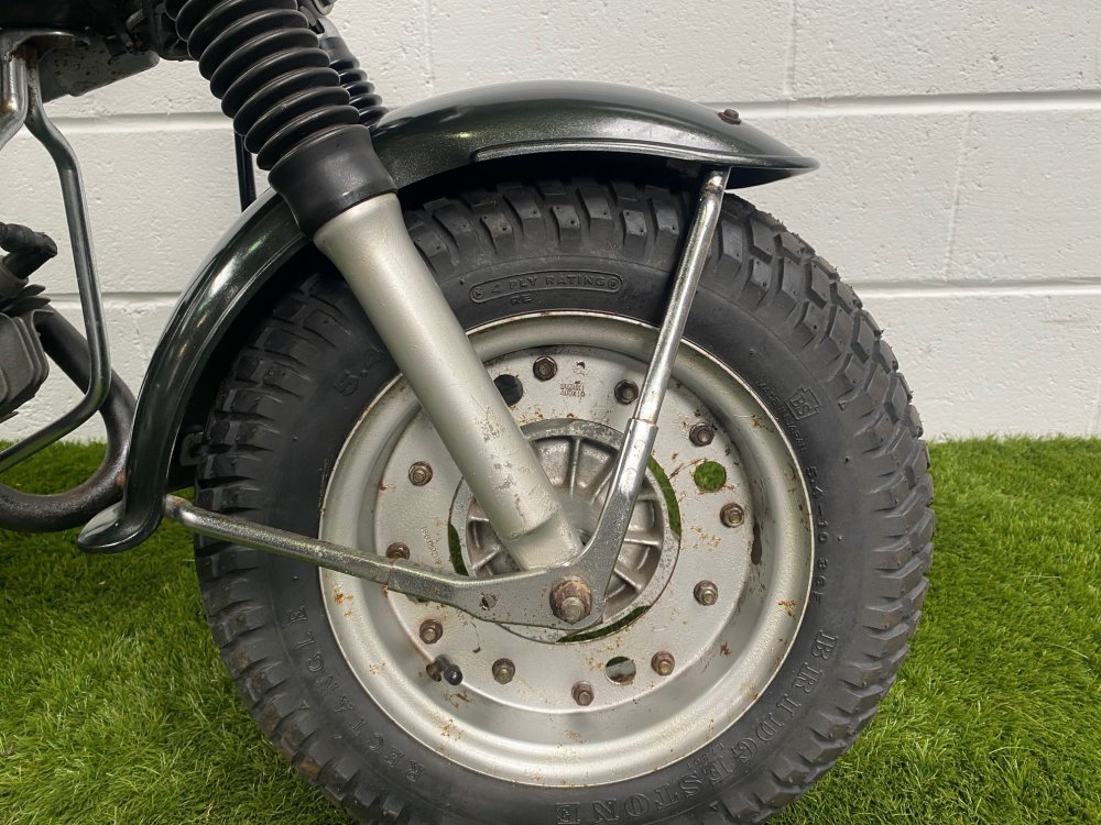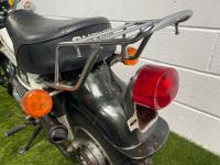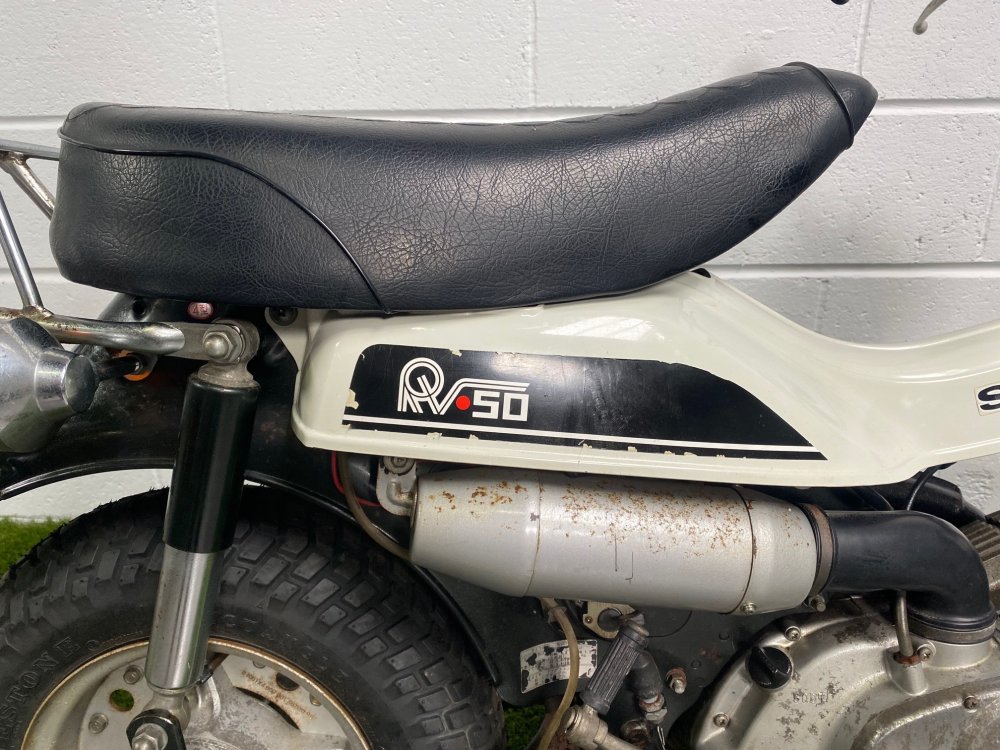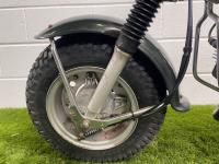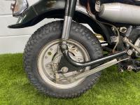 The name Van Van (pronounced Ban Ban in Japanese) is supposed to evoke both the sound of the two stroke engine and the sense of fun you get from riding this quirky wee bike. Perched atop super stocky 10-inch wheels, with a long wheelbase (relative to its height) it is a joy to look at and to ride. Despite its small stature it is designed to get a bit muddy with a raised exhaust and engine guard. A torpedo shaped air box on the right, rear rack and a hand pump - these often go missing but this bike still has it - complete the charming yet practical design. An excellent example of a Van Van RV50 from 1982. Only 2km (1 mile) on the clock.