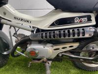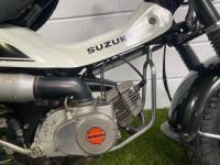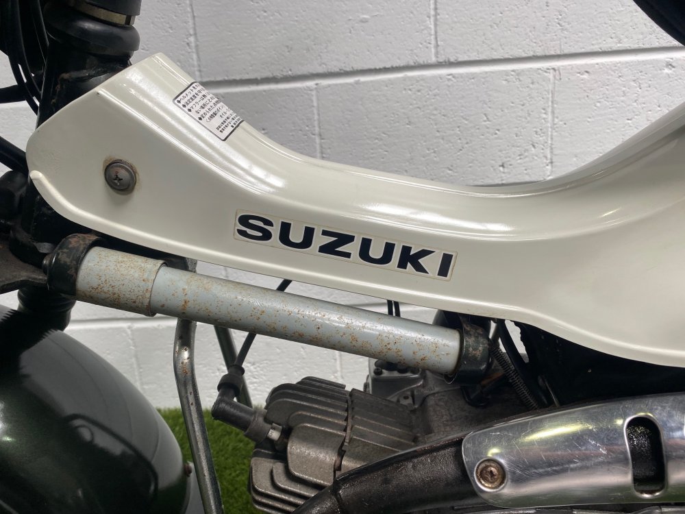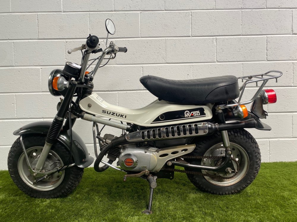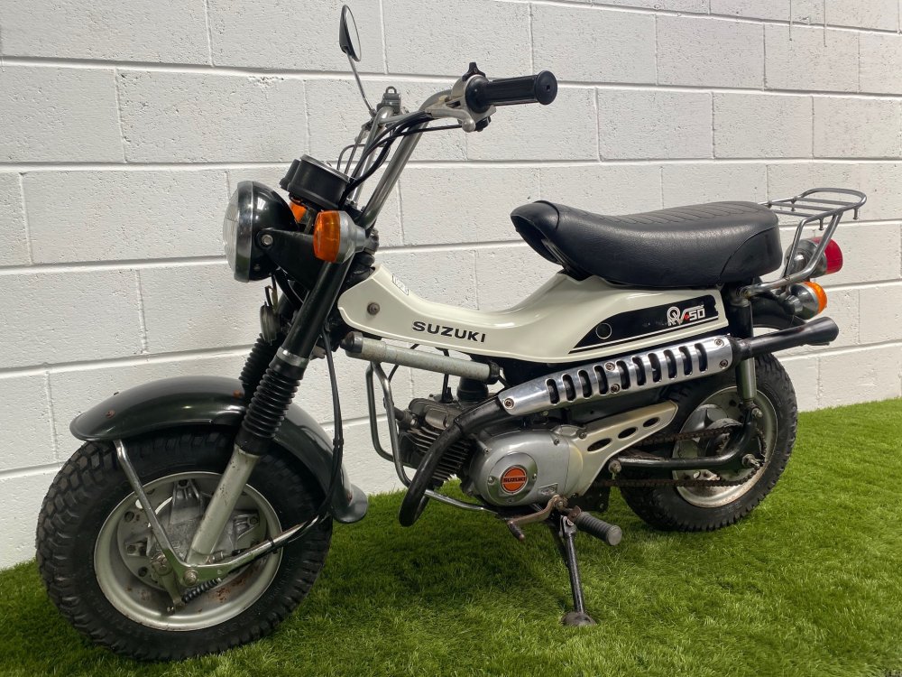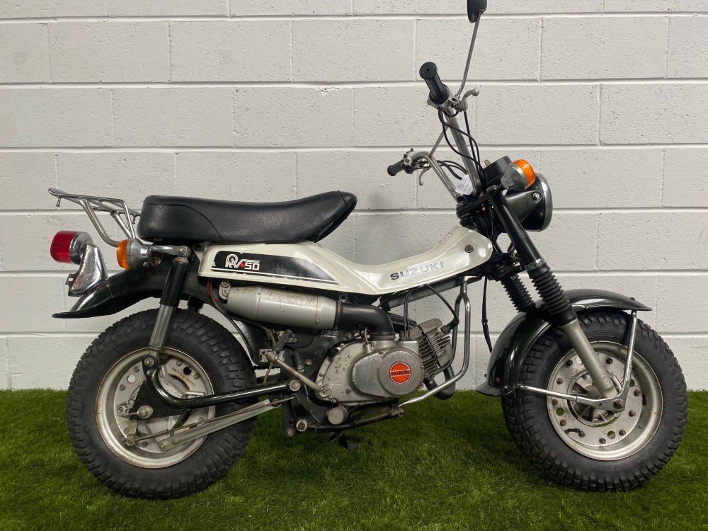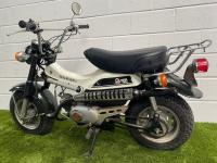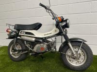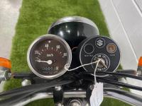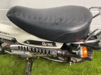 The name Van Van (pronounced Ban Ban in Japanese) is supposed to evoke both the sound of the two stroke engine and the sense of fun you get from riding this quirky wee bike. Perched atop super stocky 10-inch wheels, with a long wheelbase (relative to its height) it is a joy to look at and to ride. Despite its small stature it is designed to get a bit muddy with a raised exhaust and engine guard. A torpedo shaped air box on the right, rear rack and a hand pump - these often go missing but this bike still has it - complete the charming yet practical design. An excellent example of a Van Van RV50 from 1982. Only 2km (1 mile) on the clock.